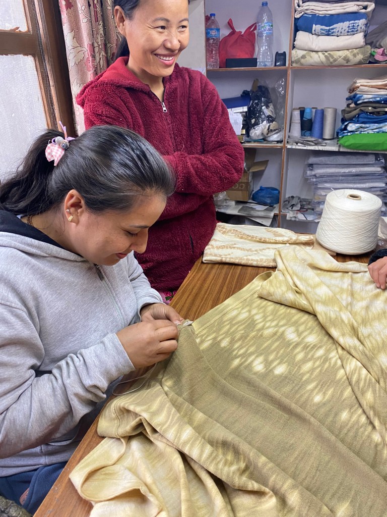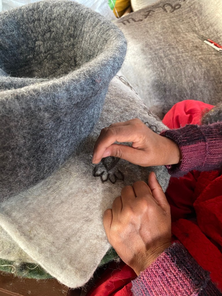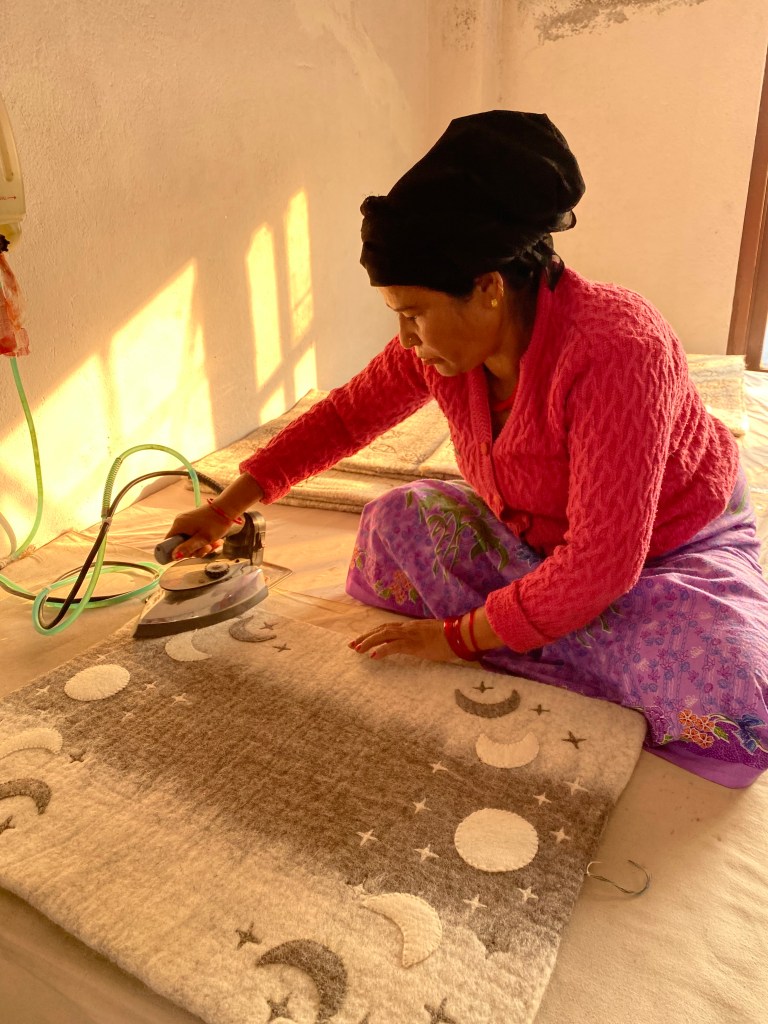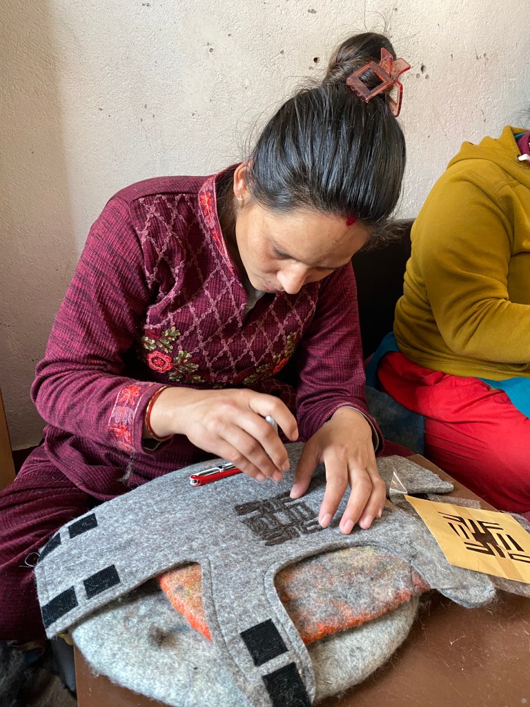 Deswegen sind wir für ein halbes Jahr nach Nepal gezogen, und haben mit Prakashs Unterstützung vor Ort eine Werkstatt aufgebaut, in der unser natürliches Spielzeug in Handarbeit hergestellt werden sollte. Ich sage dir, die Frauen, die dort arbeiten, sind wahre Künstlerinnen, die die Designs von Kasey– ausschließlich positive Symbole – sticken.