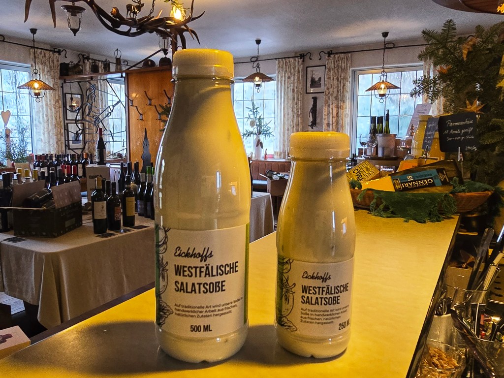 Und da Thomas mit einem Tag in der Küche dann doch nicht so recht ausgefüllt ist, versorgt er dich auch mit einem weiteren Klassiker: Die „Westfälische Salatsoße“ wird wie vor 50 Jahren zubereitet und von Hand abgefüllt – nach Geheimrezept von Betty Eickhoff, versteht sich –, besteht ausschließlich aus natürlichen Inhaltsstoffen und ist in den „Hit“-, „Dornseifer“- und „Edeka“-Märkten in der Region erhältlich. Schau doch einfach mal im Kühlregal nach, wenn dir der Weg nach Halberbracht zu weit ist und du trotzdem ein i-Tüpfelchen für den Salat brauchst… Betty würde sich freuen, dass ihr Sohn dem alten Rezept neuen Schwung verleiht, und mit der „Mediterranen Salatsoße“ hat er auch eine eigene Idee verwirklicht: Vegan und laktosefrei ist sie für jeden verträglich, und schmeckt einfach sooooo gut!