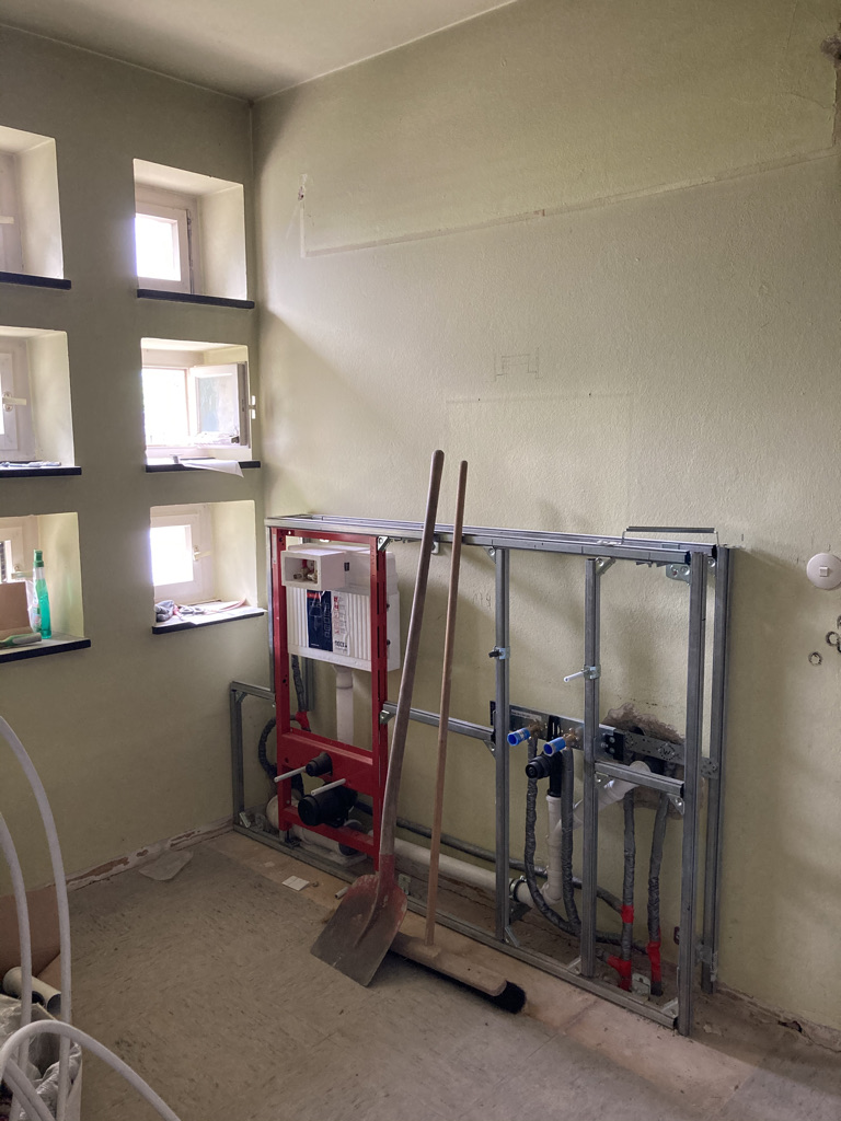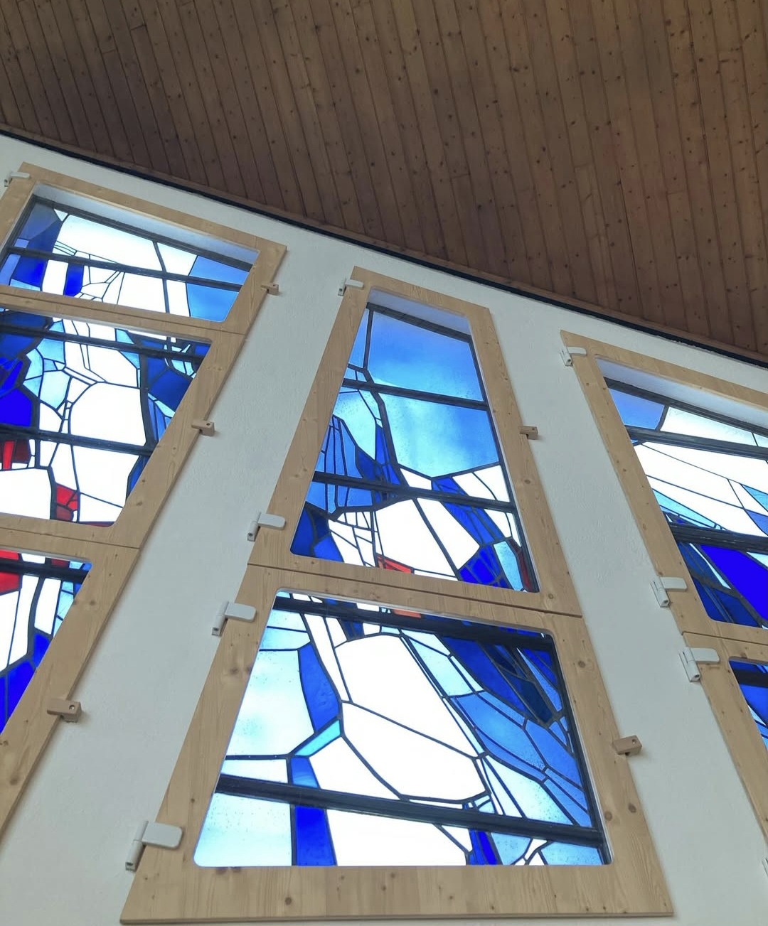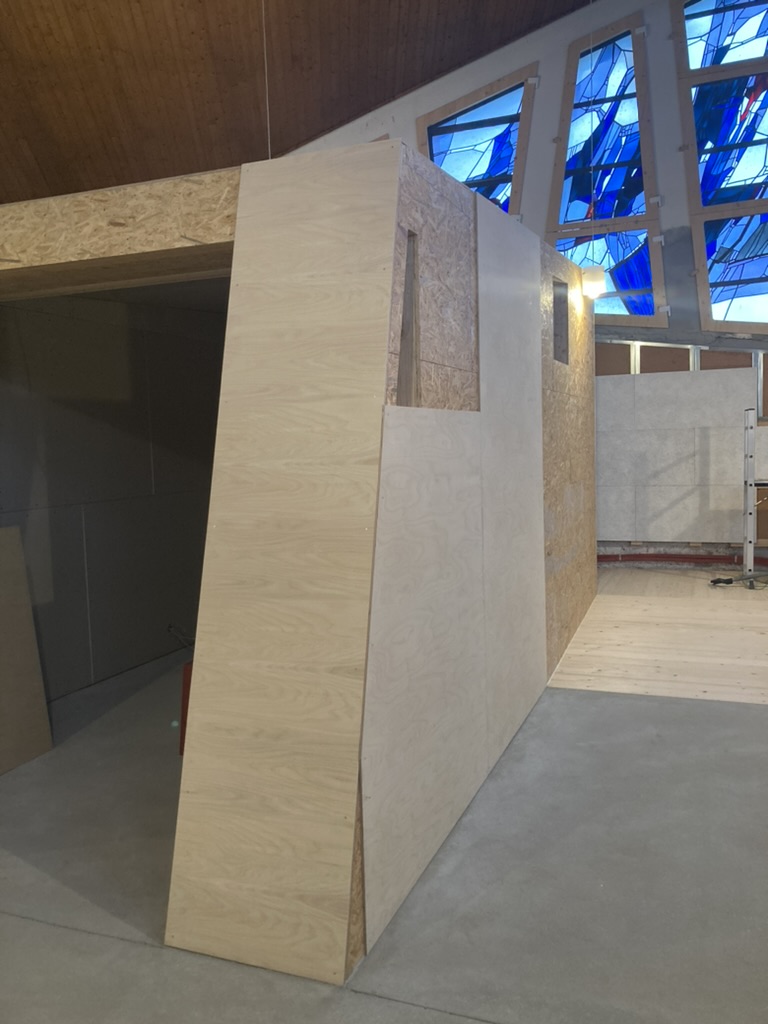 Durch die Corona-Zeit hatten auch Sandra und Reimund unter dem Material- und Handwerkermangel zu leiden, also bestellten sie alle benötigten Materialien in einem Rutsch. Eine Woche lang fuhr jeden Tag ein LKW vor, alles wurde fein säuberlich in der Mitte des ehemaligen Kirchenraums gestapelt. Nun konnten die eigentlichen Arbeiten beginnen: Die Wände wurden gedämmt, die kunstvollen Fenster mit einer Doppelverglasung verstärkt – außerdem bekamen sie Rahmen aus Holz, die ein Schreiner jeweils aus einem Stück Holz fertigte, ohne zu leimen. Ganz individuell für jedes Fenster, denn keins sieht aus wie das andere…
