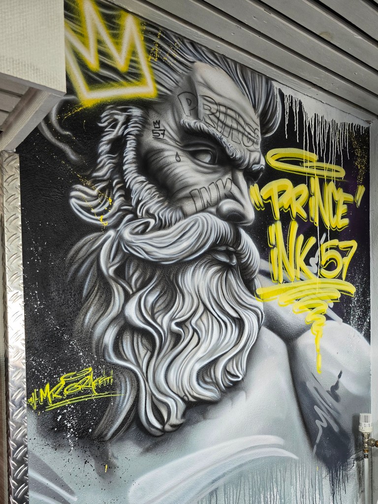 Schon beim Reinkommen merkst du, dass auch die Wände hier Geschichten erzählen. Kein steriles Weiß, keine langweiligen Poster… Ein Graffiti-Künstler hat das Studio mit individuellen Wandbildern gestaltet, die genauso einzigartig sind wie die Tattoos, die hier entstehen. Sogar Robins alter Mercedes hat hier seinen Platz gefunden – als kunstvolles Wandmotiv mit persönlichem Bezug.
