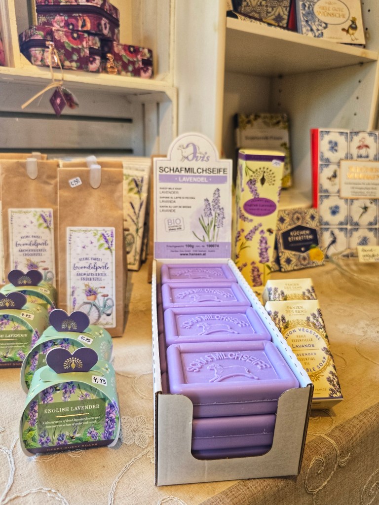 Direkt nebenan findest du das „Rose Cottage“, ein kleines zauberhaftes Lädchen mit allem, was zum Thema Rosen, Garten und Natur passt: Duftende Seifen, Bücher, hübsche Geschenke und Kleinigkeiten für Kinder. Zur Rosenblüte gibt es hier außerdem besondere eigene Produkte wie Rosensirup, Rosenaufstrich und Rosensalz – allerdings nur für kurze Zeit.