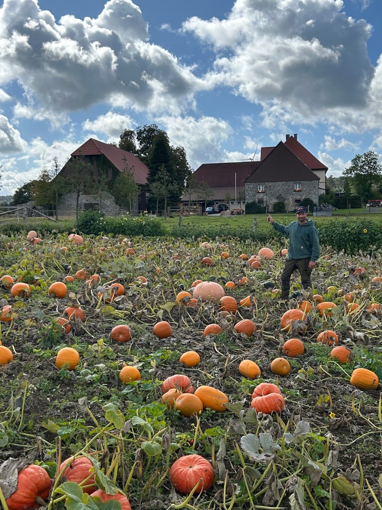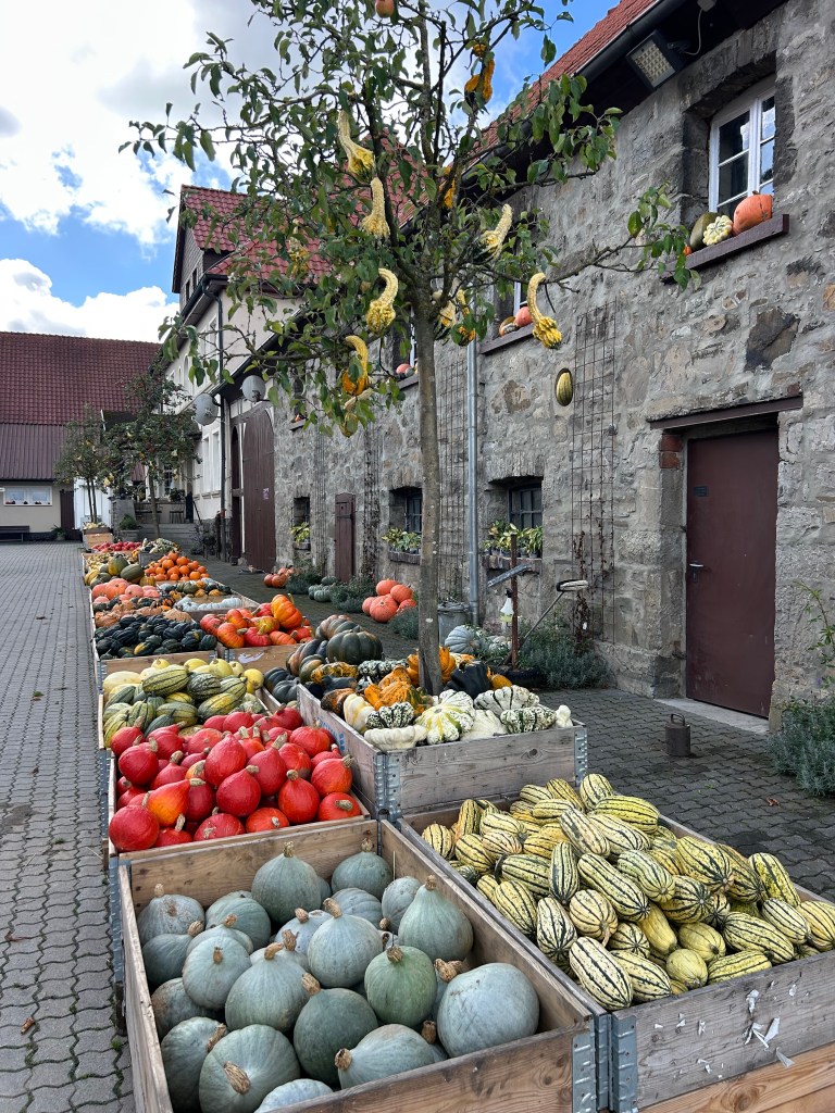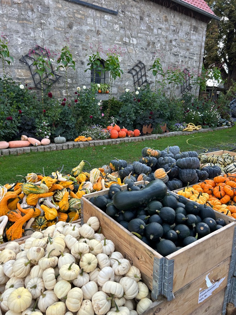 Der Kürbisverkauf ist bereits gestartet, freitags und samstags am Selbstbedienungsladen und inzwischen über den ganzen Hof verteilt. Denn der Hof steht schon jetzt voller Kürbisse, Paletten stapeln sich, noch nicht alle arrangiert, aber zum Fest wird alles beschrieben, dekoriert und in Szene gesetzt sein.