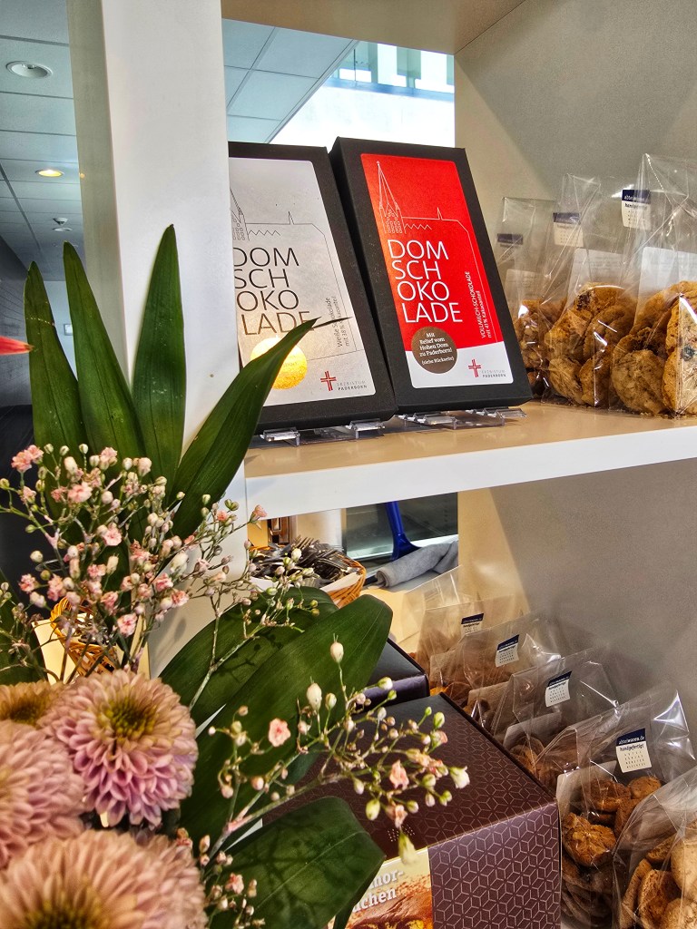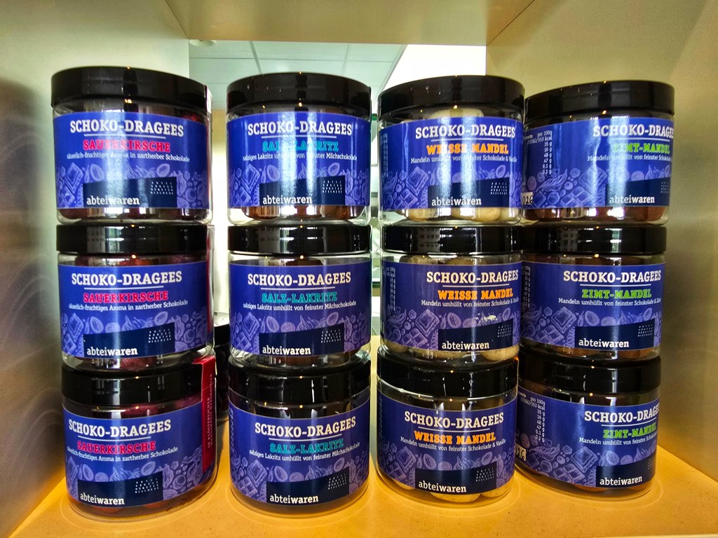Eine Tradition: Jedes Jahr wünscht sich Abt Cosmas eine neue Sorte als Weihnachtsgeschenk für Mitarbeiter und Freunde der Abtei. Zum Adventsmarkt kommt sie heraus und bleibt dann im Sortiment. Letztes Jahr war es eine Schokolade mit tansanischen Kaffeebohnen – eine Hommage an die Mission in Tansania. Statt Espresso nach dem Essen reicht hier ein Stück dieser Tafel – intensiver kann Kaffee kaum schmecken.