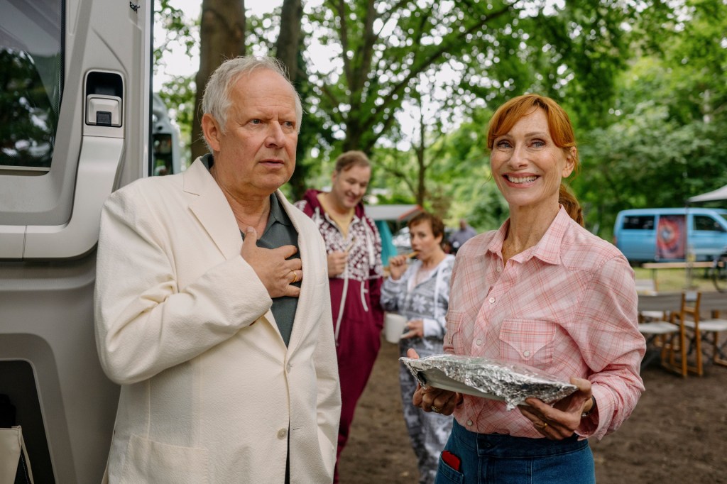 Nicht ständig, aber natürlich reden wir auch viel über unsere Arbeit. Wir haben einige gemeinsame Projekte – von der „Anfänger“-Reihe erscheinen demnächst zwei neue Teile, „Entführen für Anfänger“ am kommenden Freitag [also heute – Anmerkung der Redaktion] um 20.15 Uhr im Ersten. Wir haben auch schon gemeinsam produziert, zum Beispiel den Film „Querschuss“, der sich mit Suizid im Alter beschäftigt und in der ARD Mediathek verfügbar ist. Wir arbeiten gern zusammen – als Produzenten, Autoren und Schauspieler. Aber zu Hause geht’s meistens um ganz andere Dinge.