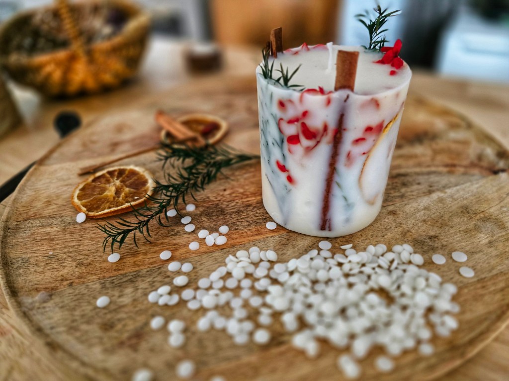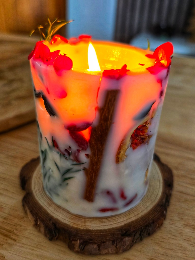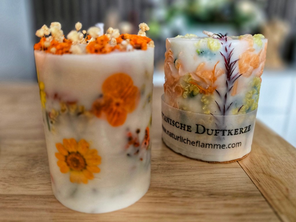 Neu in diesem Jahr sind botanische Kerzen: Kleine Kunstwerke aus Sojawachs, Trockenblumen und Naturmaterialien. Die Kerze schmilzt nur in der Mitte, während der Rand – liebevoll dekoriert – erhalten bleibt und von innen heraus leuchtet. Ist der Docht abgebrannt, kannst du einfach ein Teelicht hineinstellen – ein wunderschöner, duftender Blumenstrauß aus Wachs, der ewig hält.