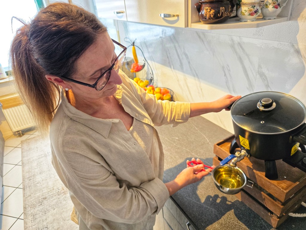 In ihrem eigens dafür angeschafften Schmelztopf bringt sie das Wachs bei exakt 60 Grad zum Schmelzen, auf dem Herd wäre das kaum machbar und zu gefährlich. Während das Wachs langsam flüssig wird, bereitet sie Gefäße, Düfte und Dekoration vor. Ihr rollbarer Schrank mit allem Zubehör macht es möglich, überall in der Wohnung zu arbeiten – flexibel und kreativ.