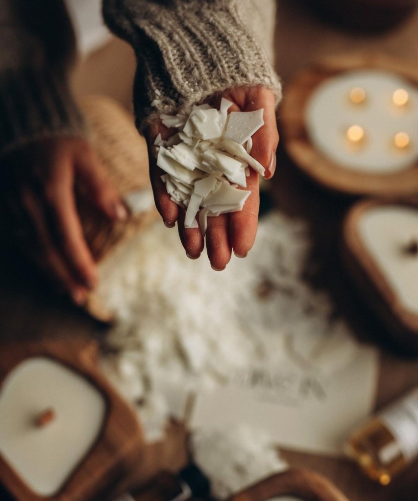 Vielleicht hast du schon auf den Fotos gesehen, dass bei Lina keine Kerze der anderen gleicht. Jede hat ihren eigenen Charakter, ist ein echtes Unikat. Damit jede Form perfekt wird, verwendet Lina für Stand- und Behälterkerzen zwei verschiedene Sorten Sojawachs – beide natürlich, aber unterschiedlich fest.