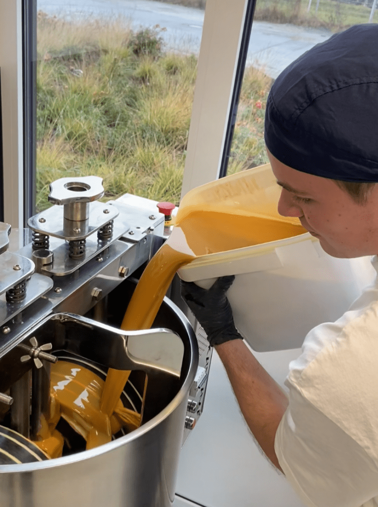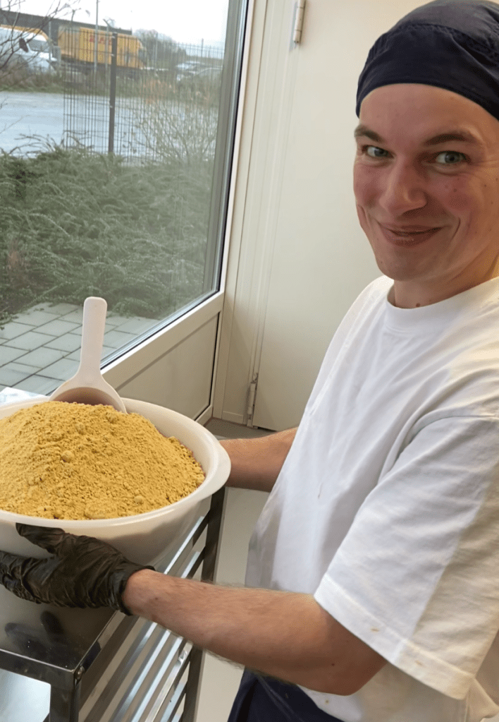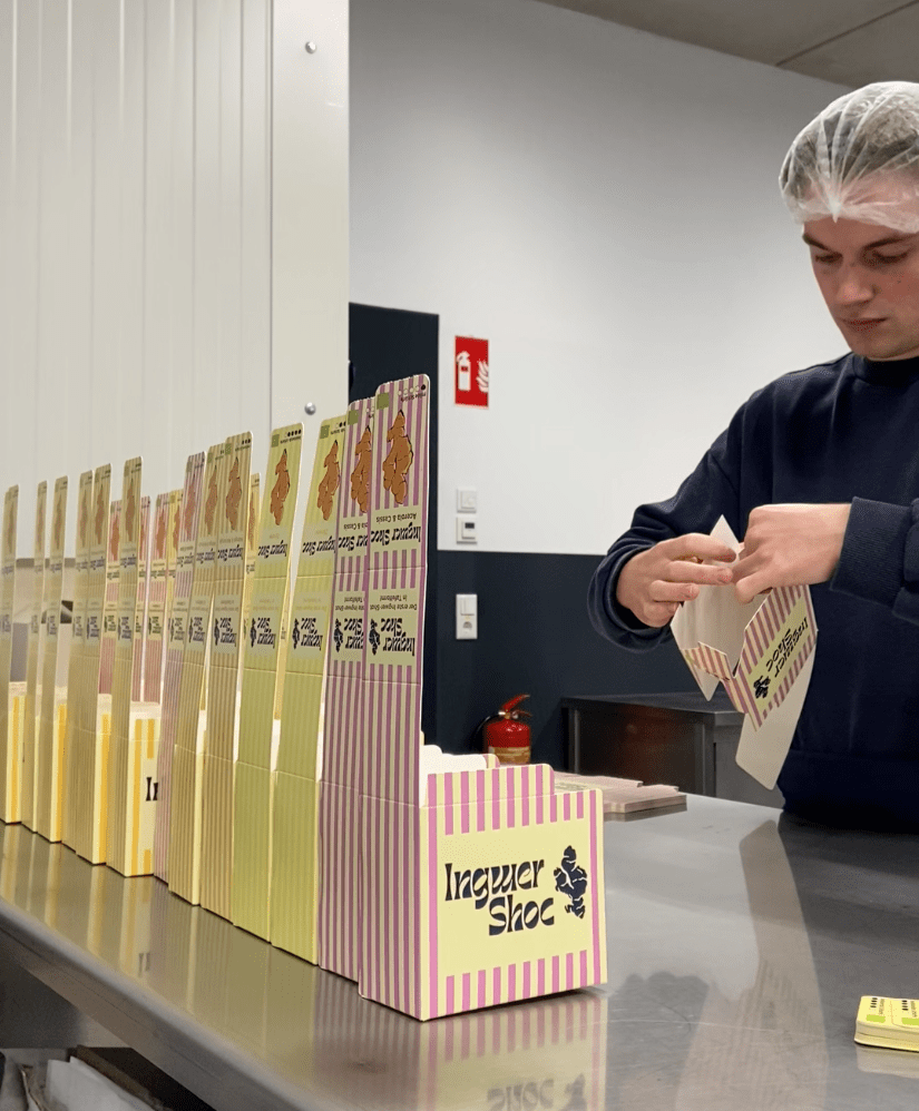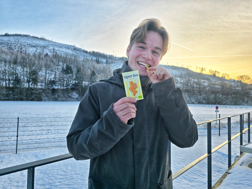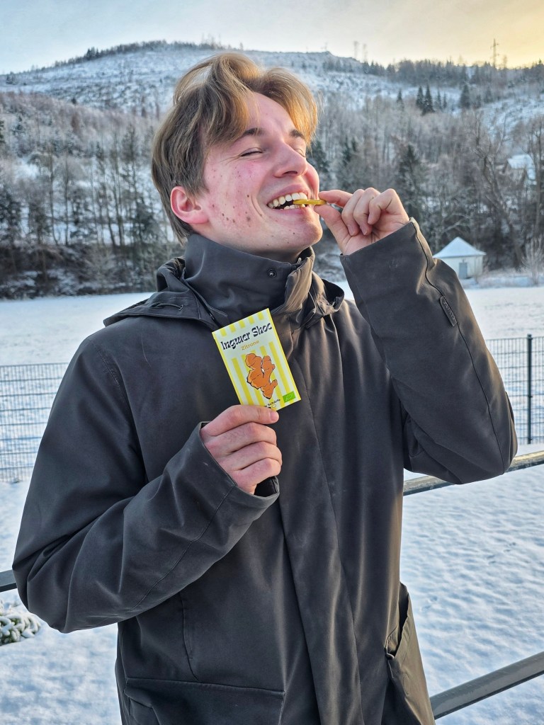Und die hatte sich bereits zuvor angekündigt: Zu Weihnachten 2024 wünschte er sich einen Melangeur. Eine kleine Steinmühle zur Schokoladenherstellung. Eine Trommel, in der Masse vier Tage lang gerührt und fein vermahlen wird. Nur war seine Idee nicht, Schokolade zu machen. Er wollte experimentieren. In seiner Freizeit. Mit Neugier. Mit Ingwer. Neun Monate später stand ein fertiges Produkt. Und als klar war, dass das funktioniert, ging er den nächsten Schritt. Bürokratie, Anträge, Gründungsstipendium. Anstrengend, aber machbar. Im September war es geschafft, und „Ingwer Shoc“ offiziell an den Start.