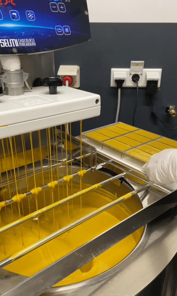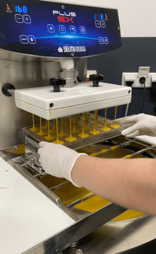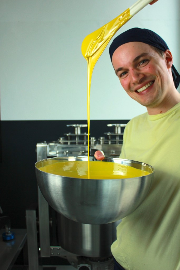Gordi hat mit unterschiedlichsten Rohstoffen experimentiert. Alles Bio. Kakaobutter war unverzichtbar, um die Tafelform zu erreichen. Dazu jede Menge Ingwer, Fruchtpulver, Kurkuma, schwarzer Pfeffer, ätherische Öle, Lecithin – und ja, auch Zucker. Weil Gordi diese Masse nicht mehr allein mit seinem kleinen Melangeur herstellen konnte, übernimmt das heute die Manufaktur „Georgia Ramon“ in Soest. Die erste Charge haben sie gemeinsam produziert. Jetzt läuft es.