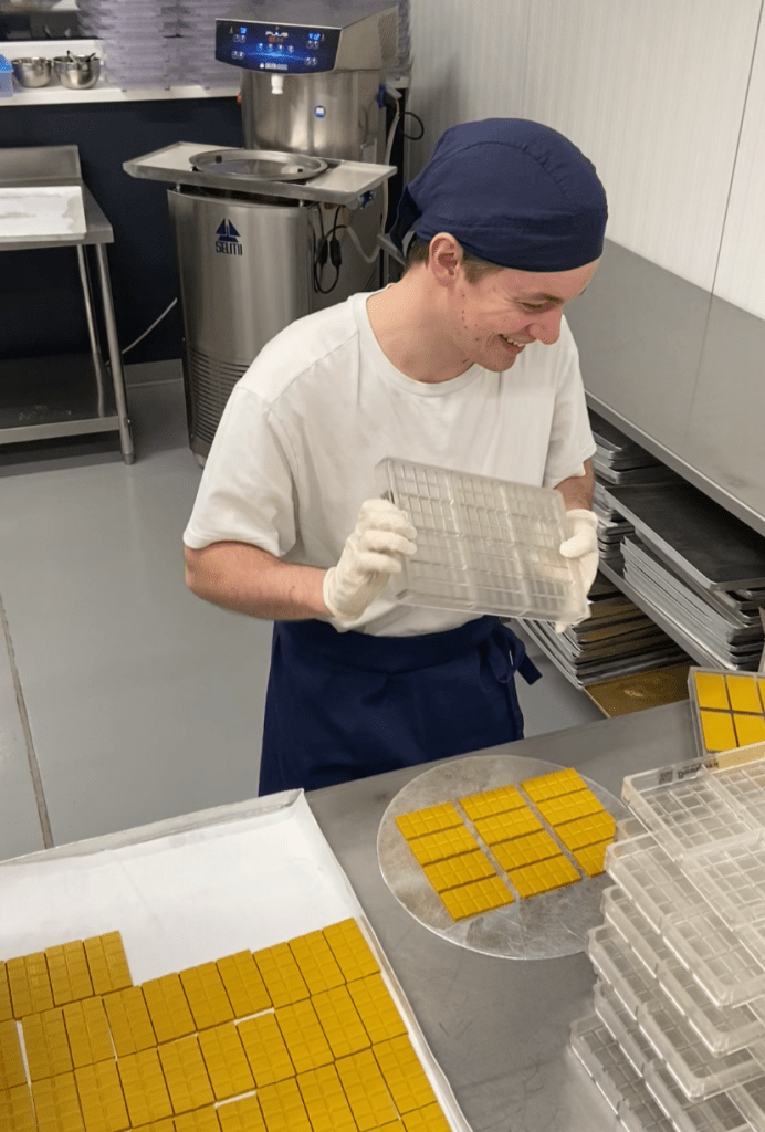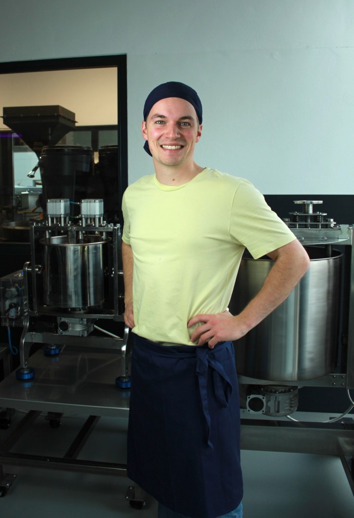 Also hat er deutschlandweit nach dualen Studiengängen im Lebensmittelbereich gesucht. Und die erste Zusage kam von einem echten Schwergewicht, und zwar von „Lindt“. Gordi zog nach Aachen, wo er auch heute noch lebt – regelmäßige Heimatbesuche inklusive, versteht sich –, absolvierte dort vier Jahre lang ein duales Studium in Süßwarentechnologie, stellte Pralinen und Schokoladen selbst her und entwickelte zur Abschlussprüfung sogar eine eigene Kreation – eine Mojito-Praline. Im Januar war die Ausbildung abgeschlossen, im Sommer der Bachelor in der Tasche. Und dazwischen nutzte er jede freie Minute, um an einer eigenen Idee zu tüfteln.