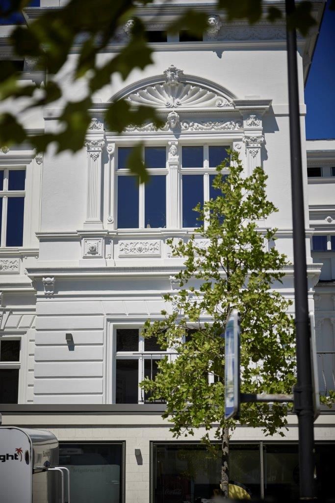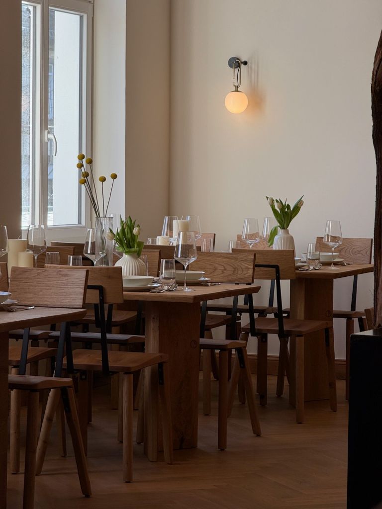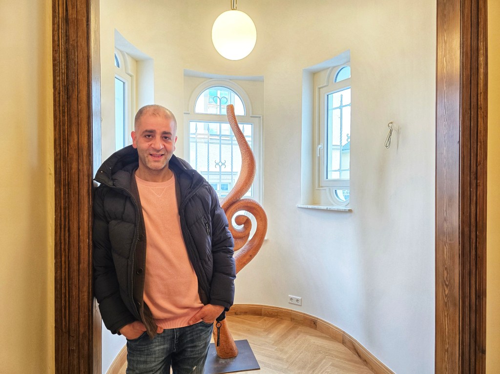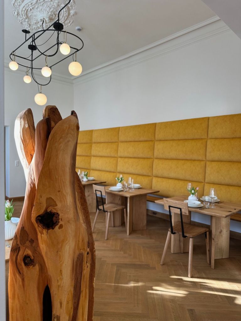 Bei den Leuchten suchte Selim ebenfalls lange – nichts aus dem vorhandenen Sortiment passte. Auch hier wurde jedes Detail bedacht. Skulpturen aus Holz eines benachbarten Künstlers ergänzen das einzigartige Ambiente. Und wie du ja schon von außen siehst: Auch die Fassade wurde schließlich vollständig erneuert und zeigt sich heute wieder strahlend im ursprünglichen Neo-Renaissance-Stil.