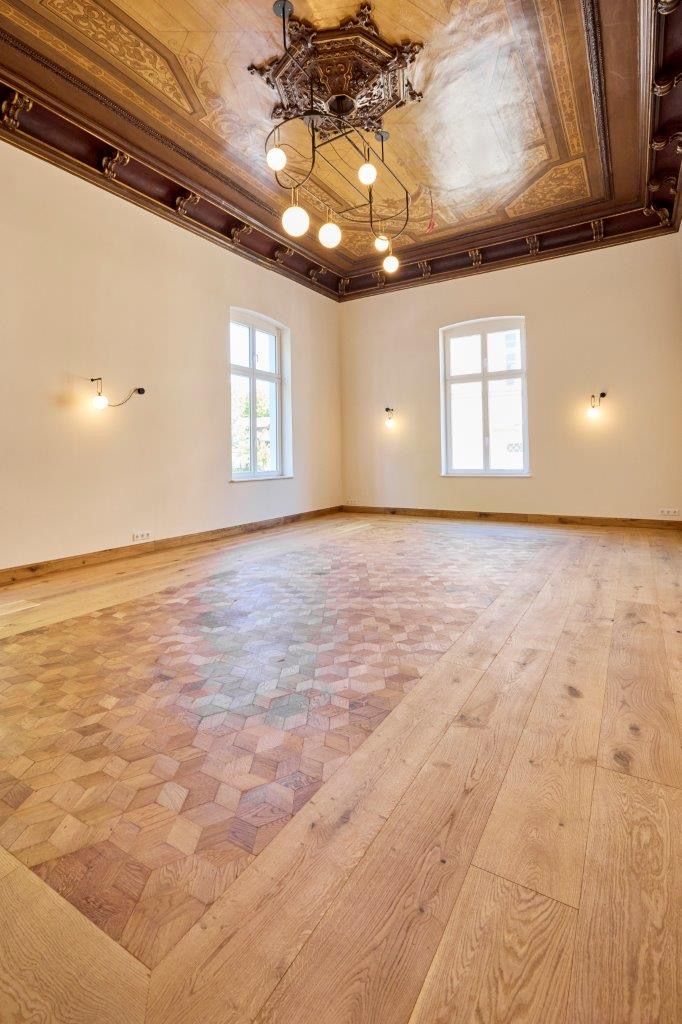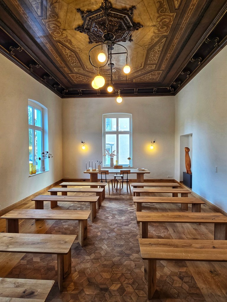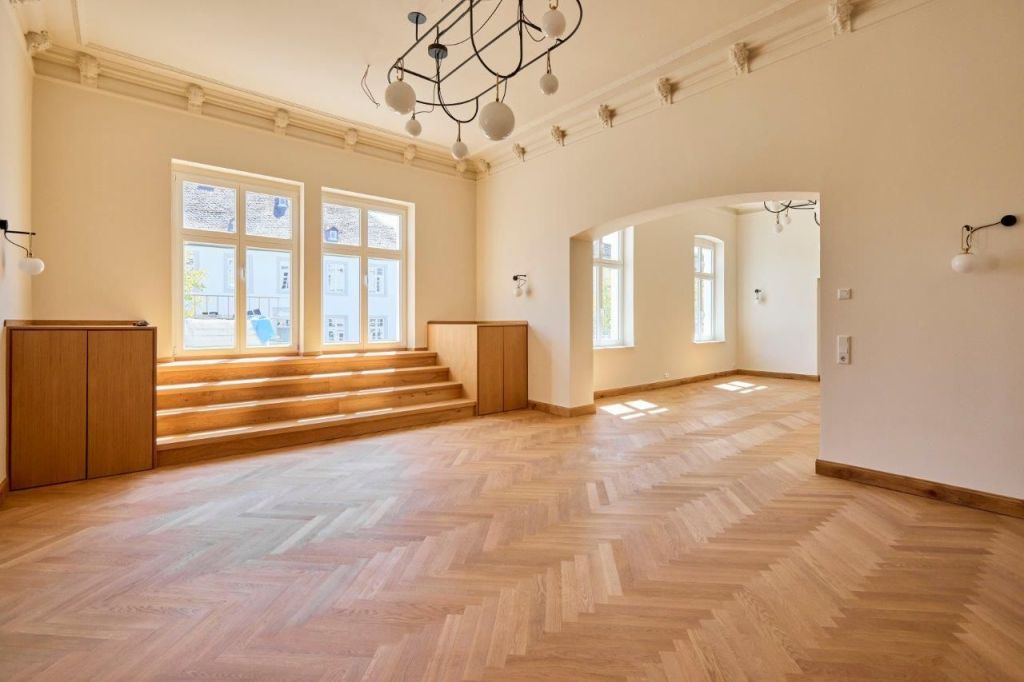 Treppenhäuser. Foyer. Türen – allen voran die Eingangstür. Holzfasertapeten, die eigentlich kunstvolle Verkleidungen aus geschnitztem Holz sind. Decken, die wieder so aussehen wie früher. Alles, was erhalten werden konnte, wurde erhalten. Wo nichts mehr da war, brachte Selim seine eigene Vision ein. Viele Türen waren zerstört, Schnitzereien entfernt, mit Holzplatten verkleidet und überstrichen. Was möglich war, wurde aufwendig restauriert. Entstanden ist eine Mischung aus Historie und nachhaltiger Moderne. Ende 2025 konnte schließlich das Erdgeschoss für Events öffnen. Und ich kann es vorwegnehmen – es ist das perfekte Ergebnis geworden, und zwar zu 105 Prozent: