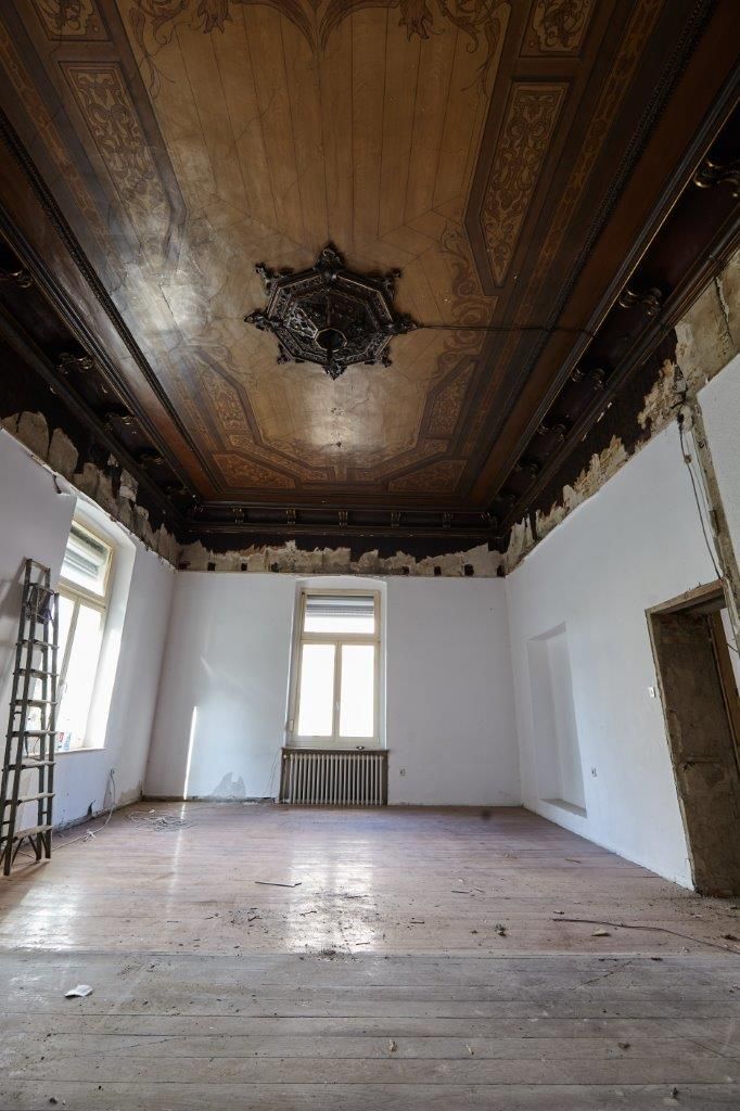 Im Trauzimmer entdeckte Selim zufällig, dass die Raumhöhe nicht stimmen konnte. Mit Leiter und Hammer entfernte er eine Zwischendecke aus Rigips – und legte eine alte Deckenmalerei frei. Zwar stark beschädigt, aber rettbar.