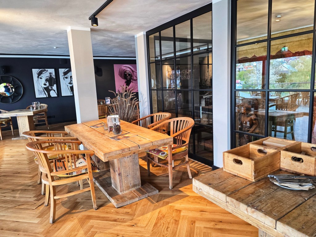 Und dann gehst du wieder nach oben. Und da merkst du: Hier wurde mehr als nur renoviert. Hier wurde neu gedacht. Die Fläche ist größer geworden. Die Fenster sind jetzt echte Panorama-Fenster. Du schaust nicht mehr nur raus – du hast fast das Gefühl, der See gehört mit zum Raum. Dazu diese Industrial-Glaswand am Treppenhaus. Ein spannendes Detail. Du bist abgetrennt – aber nicht abgeschottet. Perfekt für private Veranstaltungen. Für Tagungen. Oder einfach für einen ruhigeren Abend. Decke, Licht, Boden, Deko – alles neu. Und trotzdem wirken die alten Möbel nicht fehl am Platz. Im Gegenteil: Sie geben dem Ganzen genau die Wärme, die es braucht.